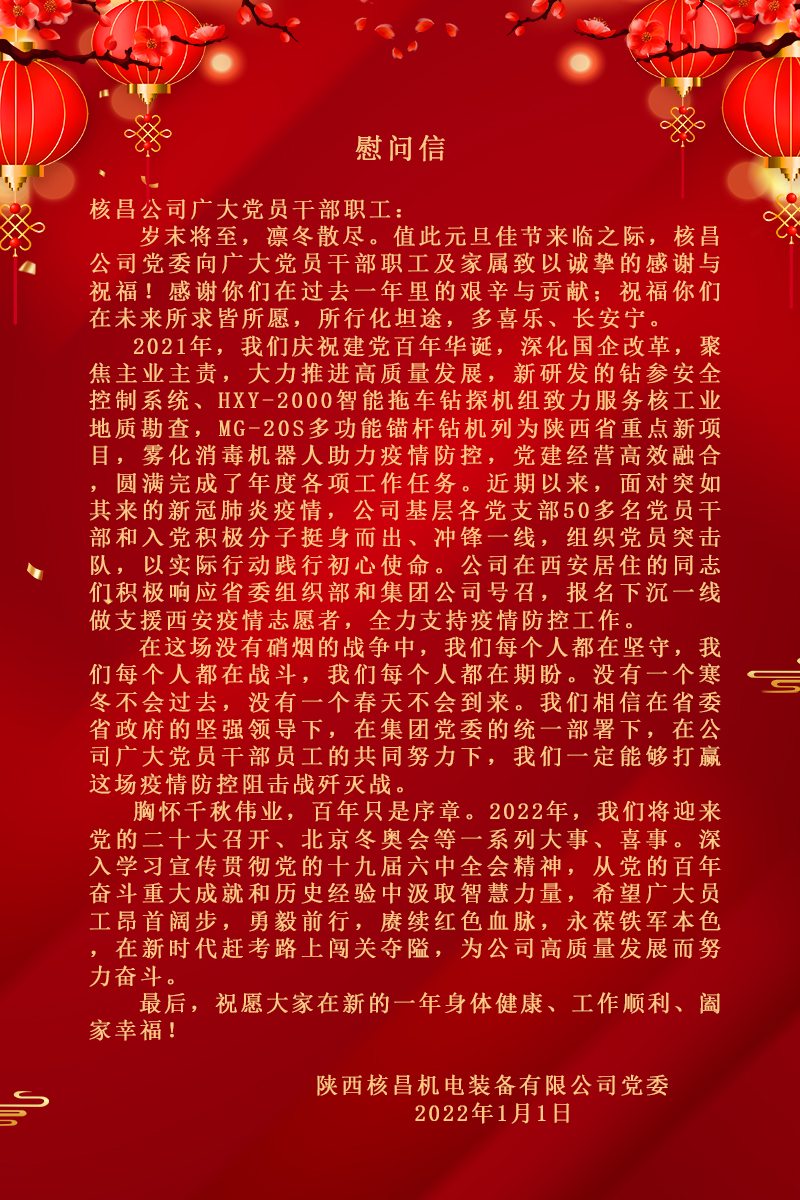 1月1日上午10時(shí),黨委委員、副總經(jīng)理、工會(huì)主席李偉一行來(lái)到公司單身職工宿舍,在元旦來(lái)臨之際,對(duì)九位就地過(guò)節(jié)的單身職工進(jìn)行節(jié)日慰問(wèn),送上公司黨政工的節(jié)日問(wèn)候和美好祝愿。慰問(wèn)時(shí)...