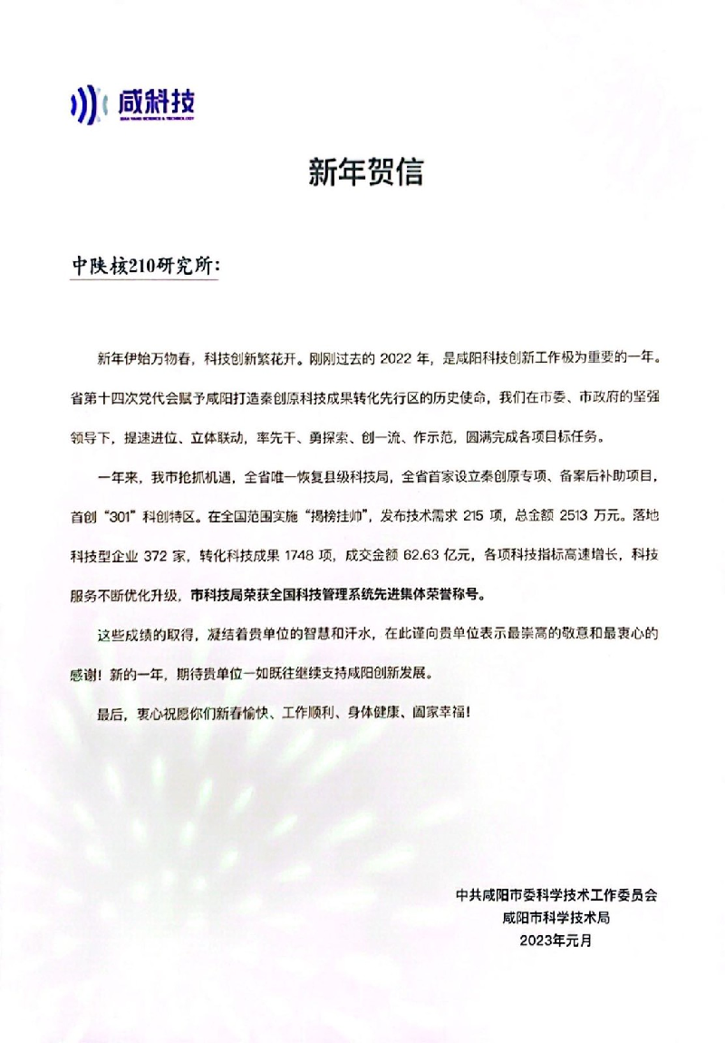 最后,黨委副書記、總經理李偉表示,感謝科技局對公司多年來的幫助與支持。下一步,公司黨委將帶領班子成員積極組織職工學習新思想、干好來年工作,推動更多科研成果在咸陽市轉化和產業化,為咸陽市經濟高質量發展多作貢獻。