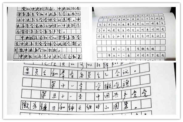 在抄寫《黨章》活動中,老同志們懷著對黨的深厚感情和敬畏之心,認真學習,認真抄寫。享受政府津貼的高級工程師秘華年同志抄寫的黨章,字體端正、頁面整潔。88歲高齡的邵汝澤同志,懷著對黨的深厚感情,完成了手抄黨章;86歲高齡的家屬黨員朱連君同志,文化不高,仍然認真抄寫,將抄寫本的正反兩面全部抄滿;退休干部劉寶元同志用毛筆小楷抄寫黨章,他說:“抄黨章活動讓我們老黨員退休生活很充實,人說眼過千遍不如手抄一遍,在抄寫過程中,我對《黨章》內容又重新學習了一遍。”在他的帶動下,兒子劉紅軍一筆一劃從頭到尾工工整整抄完了黨章。