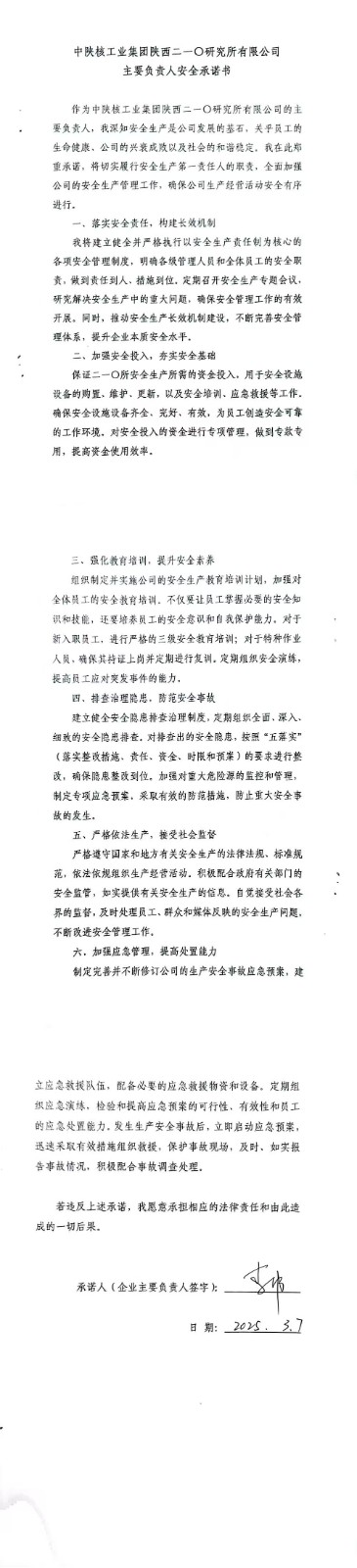 中陜核工業(yè)集團陜西二一〇研究有限公司主要負責人安全承諾書